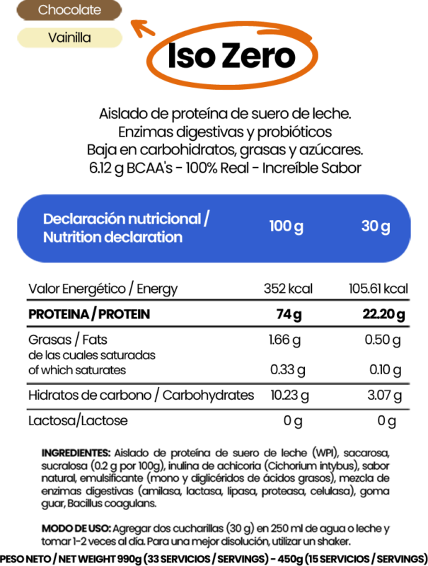 • Aislado de proteína de suero de leche (WPI), sacarosa, sucralosa (0.2 g por 100g), inulina de achicoria (Cichorium intybus), sabor natural a vainilla, emulsificante (mono y diglicéridos de ácidos grasos), mezcla de enzimas digestivas (amilasa, lactasa, lipasa, proteasa, celulasa), goma guar, Bacillus coagulans.